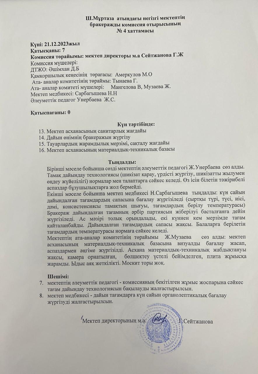 Бракераж комиссиясының отырысы » №6 орта мектеп