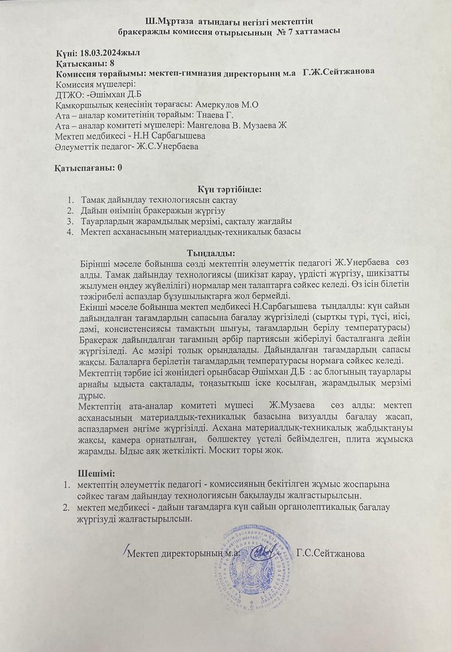 Бракераж комиссиясының отырысы » №6 орта мектеп